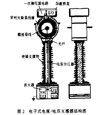 電流互感器設備由電流檢測單元和電壓檢測單元兩部分組成。前者選用羅柯夫斯基線圈作為電流傳感器,有源電子器件結束信號的數宇調制;后者選用電容分壓器作為電壓傳感器。高壓端電子線路電源由一個輔助電源感應線圈直接從母線上獲取。羅氏線圈和電源感應線圈安裝在母線上。高壓端信號調制和電源調度電路板置于·一個鐵磁屏蔽盒中,電流信號在高壓端經AD轉化、E/O轉化后調制成光信號,經過光纖傳送到低電位端。依據需求,可以將信號繼續用光纖傳送到遠方的控制室,也可以就地經O/ED/A轉化,放大成仿照電流信號,母線電壓經電容分壓器轉化成低壓信號后,調制成光信號,經光纖傳送到控制室,也可以就地經校準、溫度補償后,給出仿照電壓信號、一個陶瓷套管既用作高壓部分元件的絕緣支撐,一起又是傳輸電流信號的光纖和電容分壓器的通道。